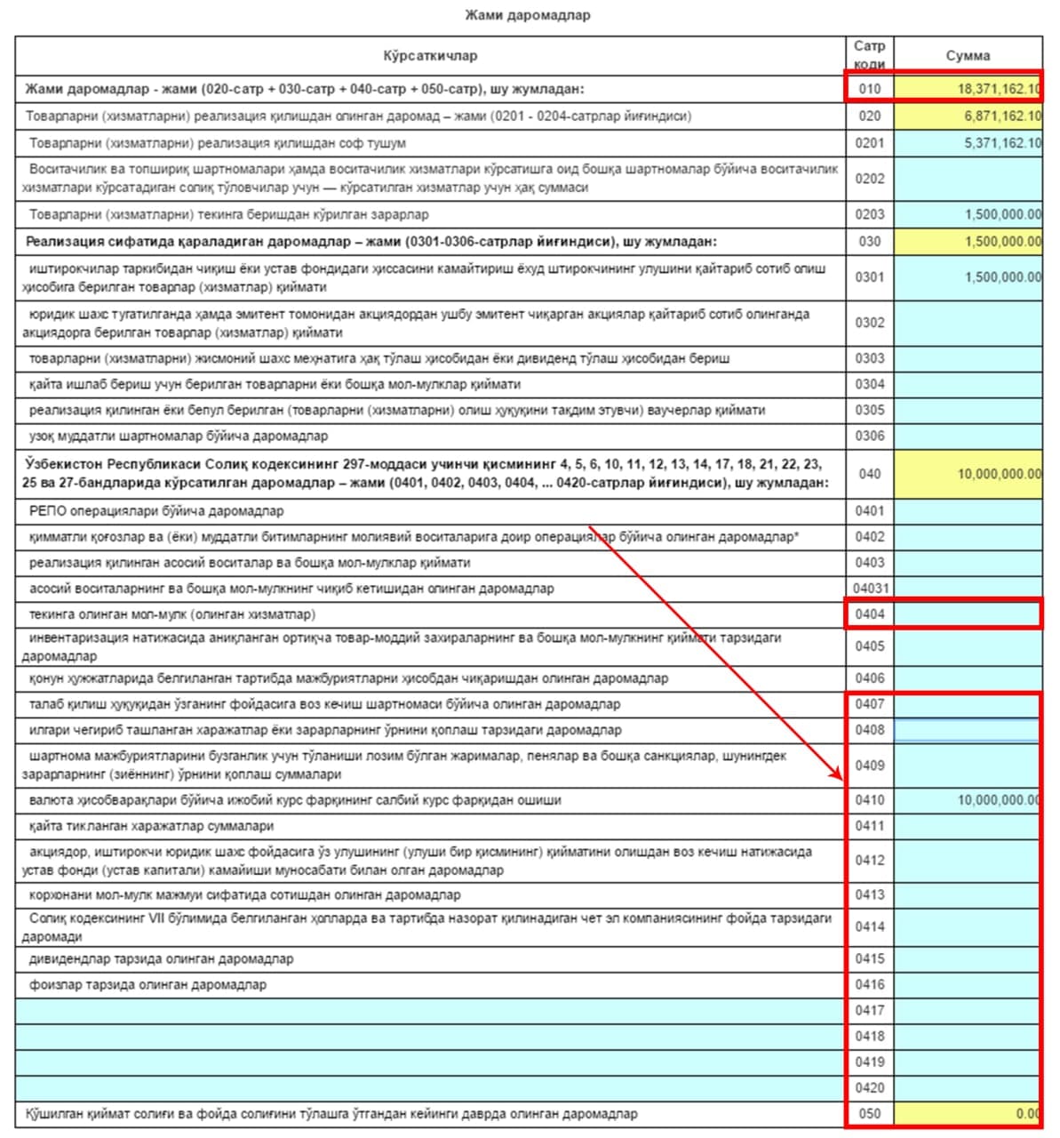 Шунингдек, фаолият турига боғлиқ бўлмаган 0404, 0410, 0411, 0412, 0414-0420-сатрларда кўрсатилган бошқа даромад суммалари солиқ солинадиган жами даромадга (1-илова 010-сатр) қўшилиши учун қўлда тўлдирилади.